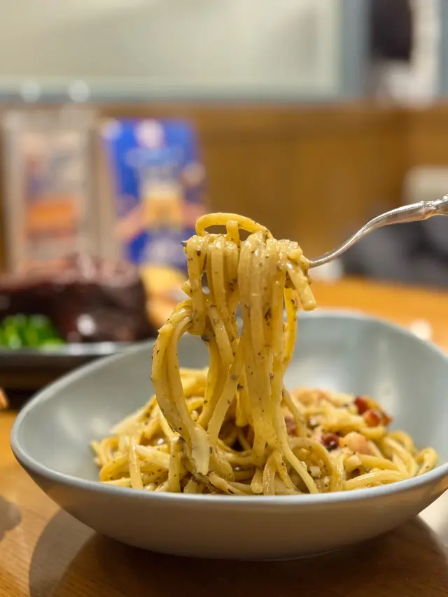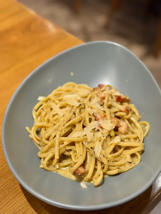 鹹鮮帶煙燻味的煙肉肥瘦各半,掛汁的意粉細滑輕彈,醬汁帶淡淡松露及蛋香,加上芝士片更添美味