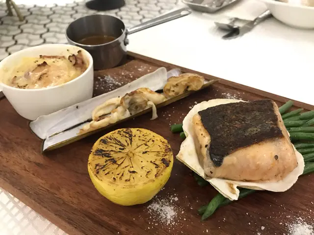 之後就嚟main course, 燒挪威三文魚、象拔蚌、扇貝配忌廉麵鼓汁