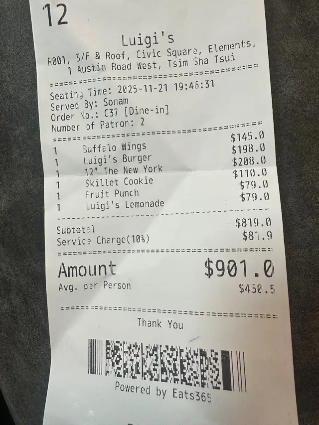 先講小食嘅 Buffalo Wings(水牛城雞翼),外脆內嫩,微辣刺激味蕾,啱晒同朋友分享。主菜係 Luigi’s Burger(Luigi漢堡),牛肉厚實多汁,加埋芝士同生菜,咬落去好滿足 🍔。仲有 Pizza - 12” The New York(12吋紐約薄餅),自家製,芝士香濃,簡單但好味 🍕。