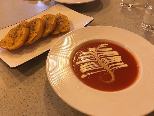 蒜蓉包我諗啲調味都幾重下口,好重牛油,應該係搽咗勁多牛油,因為包其實已經林晒,是日餐湯應該係蕃茄濃湯但我諗個湯應該都重味精