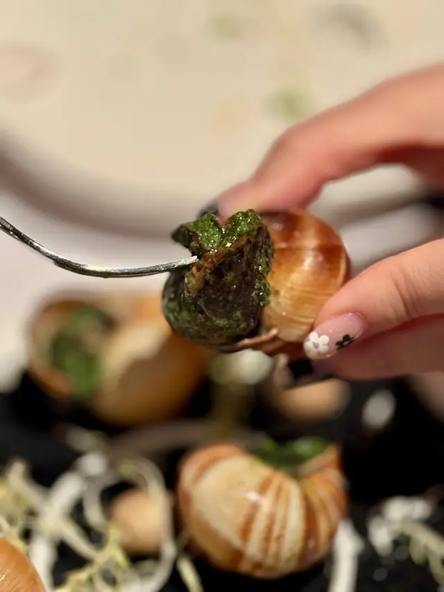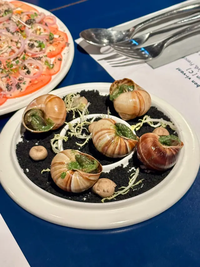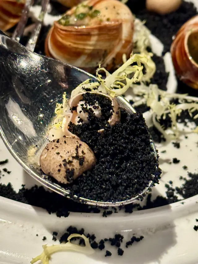 Escargots - 焗田螺,墊底黑黑的是黑巴馬臣芝士,烤焗後更見咸香,可以伴隨拌碟中的蘑菇🍄🟫同吃,田螺口感彈牙,整個配搭非常驚喜💫 Salad