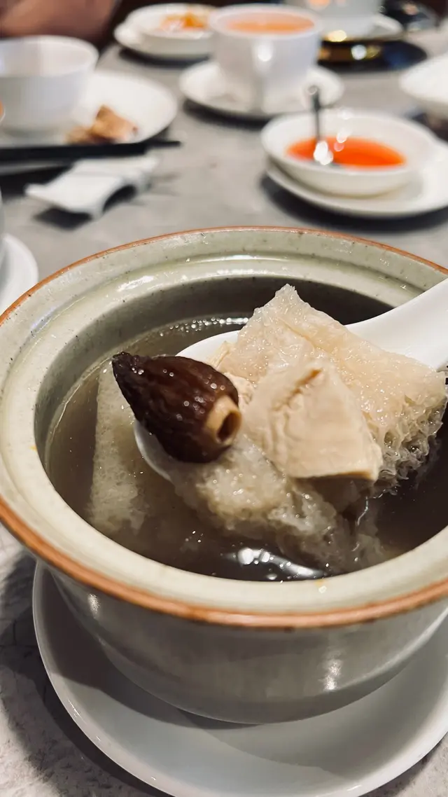 令日燉湯是⭐️螺頭羊肚菌竹笙燉雞,湯色清澈卻滋味濃郁,滋陰潤燥。