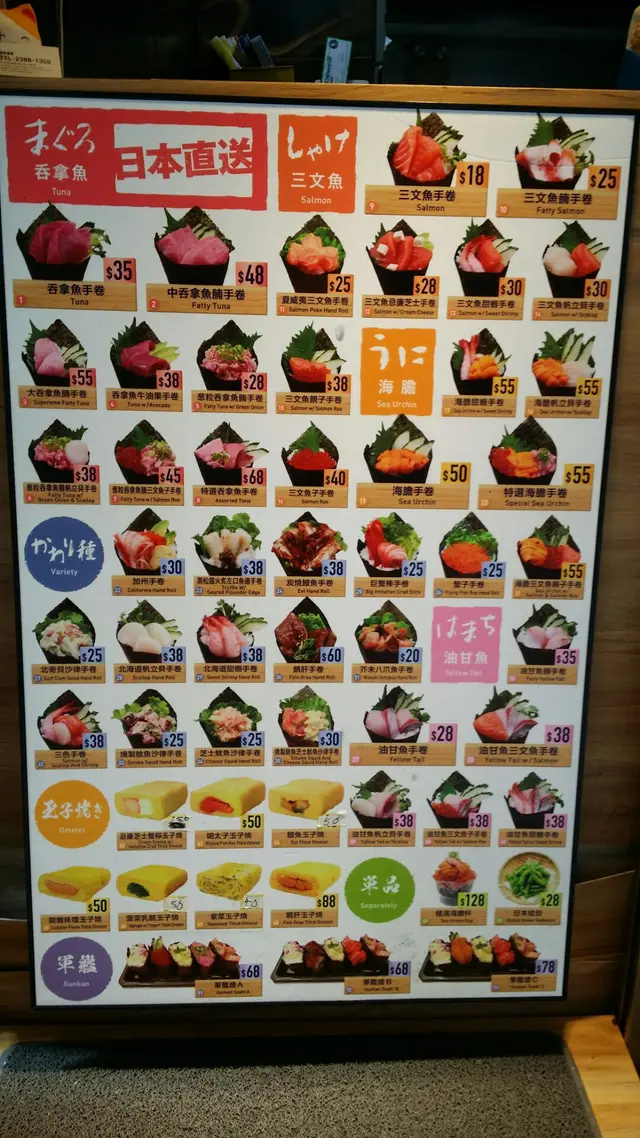 至於「手卷野村」的餐牌,餐牌只是一大塊的大型價錢牌,掛在「手卷野村」門口的旁邊,而且手卷跟壽司種類價錢,都被「手卷野村」縮小,收藏得肉眼都不容易看得清楚。