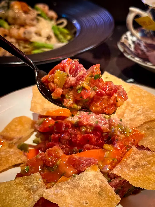 生牛肉份量超多,口感軟滑有嚼勁、毫無腥味。調味恰到好處,搭配脆片,口感層次豐富