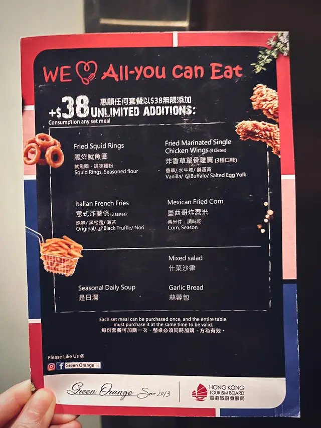 套餐加$38 就可無限追加前菜,款式總共有七款之多,包括脆炸魷⿂圈、炸香草單⾻雞翼(香草/⽔⽜城/鹹蛋⿈)、意式炸薯條(原味/⿊松露/海苔)、墨西哥炸粟⽶、是⽇湯品、雜菜沙律和蒜蓉包,炸物小食即點即製熱辣辣,個人特別推介炸魷魚圈,外層粉漿炸至金黃香脆,肉質新鮮彈牙不過韌。