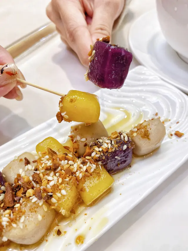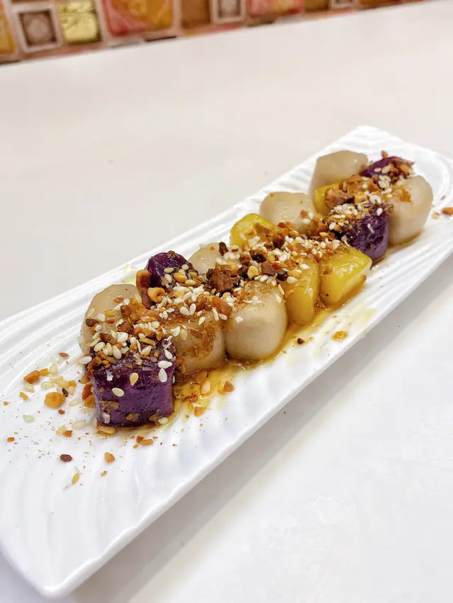 三色小芋圓上面撒滿芝麻花生碎,口感柔韌又有噍勁😋一定要趁熱哦~會更加軟綿😉