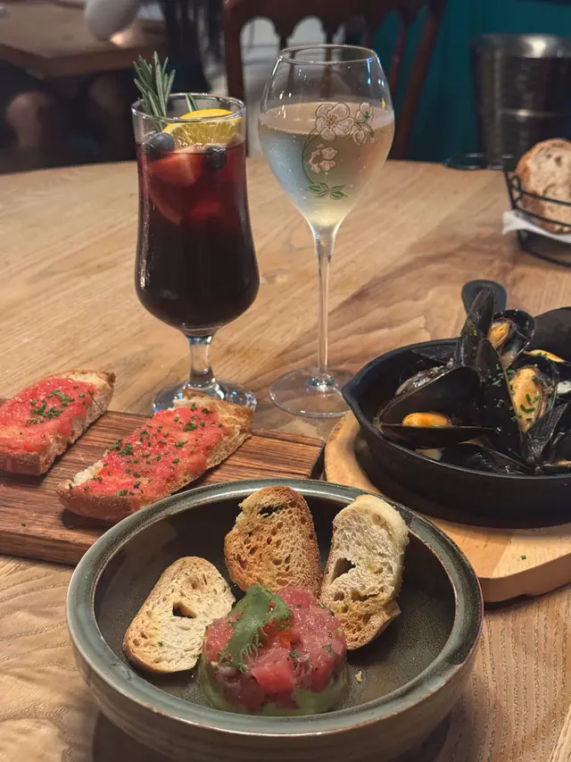 前菜有三款,西班牙蕃茄麵包脆口,上面塗上蕃茄蓉、橄欖油同香草,口感清新食落有橄欖油香。白酒用上白酒、辣椒、洋蔥等等嘅香料烹調,🌶️更能突出海鮮嘅滋味。仲有吞拿魚他他,由三文魚粒粒拼成底部有牛油果醬,配上香脆麵包,強烈口感對比更加好食。