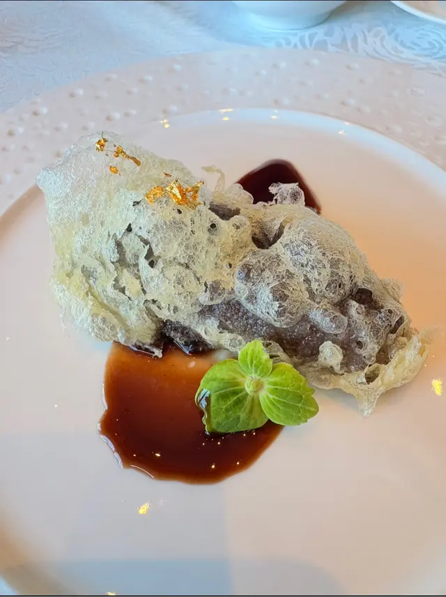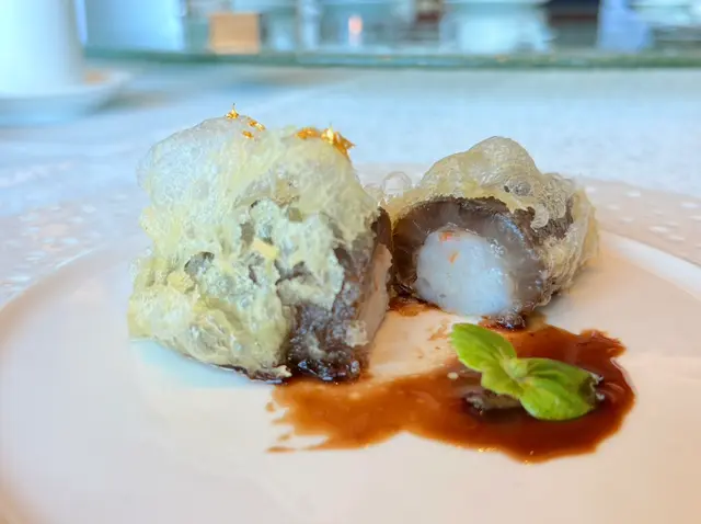 「柚子黑醋脆皮百花釀遼參」,外面脆皮包住鮮甜嘅蝦膠,加上柚子黑醋汁,實在係個味覺盛宴。每一口咬落去都能感受到脆、嫩、甜、酸的多重味道,絕對係不得不試嘅一款。