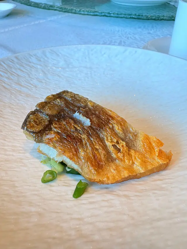 接下來的「香蔥海鹽煎馬友」,就係用咗一啲小心思,馬友魚首先人手去骨,然後浸泡入味,最後用蔥油慢煎至金黃色。咬下去外皮先係香脆,然後再嚐到魚肉的鹹香和鮮嫩,特別搭配細蔥一齊食,送飯一流。