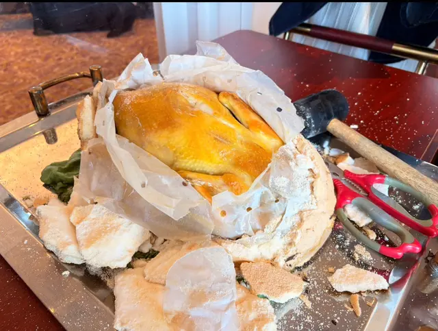 至於「招牌火焰鹽焗雞」,呢道菜就係深受食客熱愛,雞肉浸過粗海鹽,然後用牛油紙包裹,最後上桌前用白酒點火,嗰陣香氣真係令人食指大動。撬開洩出嘅鹽層,你會發現雞肉嫩滑,仲有多咗一份獨特嘅濃郁滋味,最正嘅係好玩又好睇。
