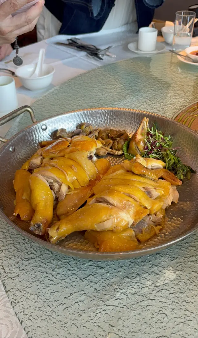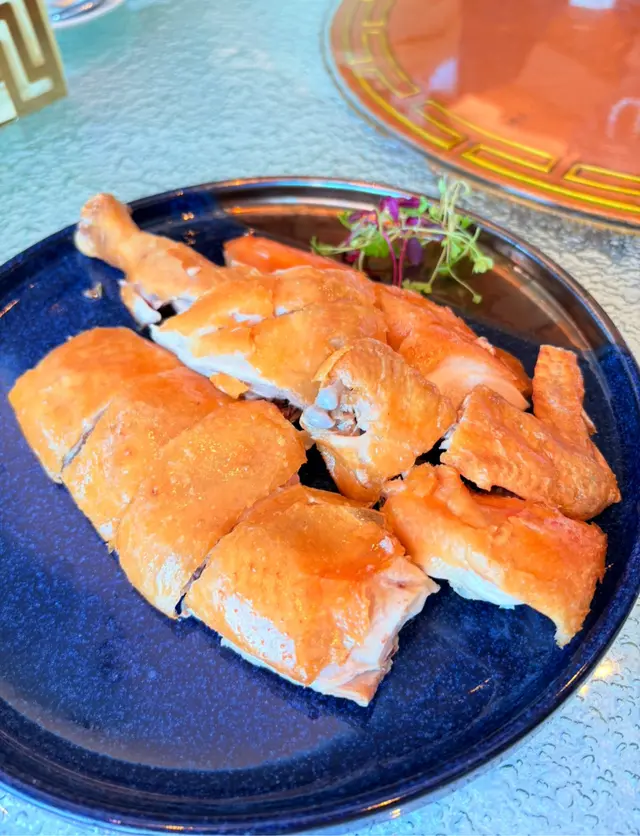 「玻璃脆皮貴妃雞」,雞肉用火腿、瑤柱同蝦米咁熬製出來,味道已經很不錯,最特別就係上桌前用熱油淋上去,令到雞皮薄如紙、脆如玻璃,口感層次非常豐富,真係好嫩滑。