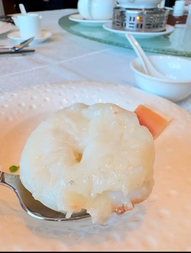 「蜜餞火方玻璃明蝦球」,呢個明蝦球真係大得驚人,遠睇差唔多一個雞包咁大,食落去感覺鮮嫩而且與蜜餞火方一齊食時,嗰種甜中帶鹹嘅滋味好夾,絕對令人難以忘懷。