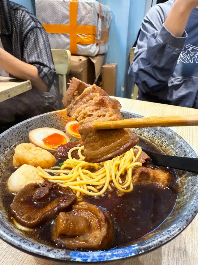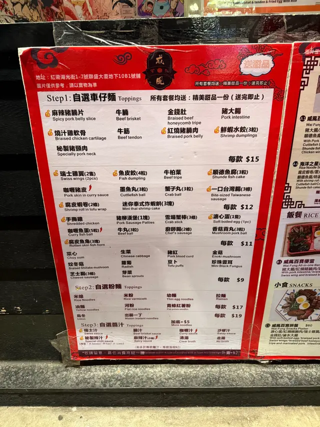 Menu有唔同配搭選擇,威風百麵應該係最受歡迎的,入面有紅燒豬腩肉,豬大腸,墨魚丸,魚腐,糖心蛋,冬茹,雞翼。份量超級足,配料新鮮同入味,配搭埋油麵先係最正既車仔麵。