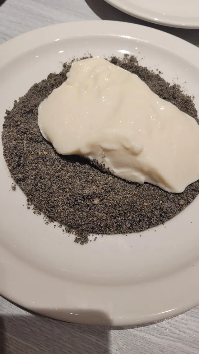 甜品方面,黑芝麻牛奶麻糬又係好味到爆,牛奶煙韌Q彈,類似糖不甩但又好食多幾個層次,加埋海量嘅黑芝麻碎,我地將牛奶麻糬切成小件,每件都幫佢地係黑芝麻海到滾黎滾去,每啖都係爆多黑芝麻,超超超好食。