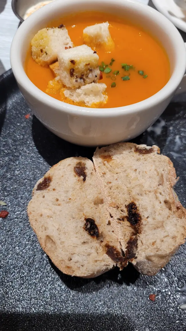 餐湯有2款選擇,我同同事分別各揀一款,黑松露蘑菇湯及法式番茄濃湯,濃郁好味道,跟湯嘅無花果蜜糖包都好食,連麵包都唔馬虎就知餐廳係幾講究✨