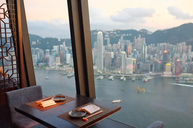 最近這幾次來都剛好天色都有點矇矇。這日走進餐廳,就被窗外美麗的維港兩岸景色吸引了。夏日日照長,已經晚上7點多但仍有藍天,一路吃、一路從101樓高空看著窗外天色漸變黑和燈光亮起,感覺真好。