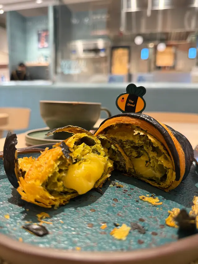 牛角包造成非常特別的啡色夾黑色,切開一半見到由本地蜂蜜製成的custard 醬,質感頗濃稠,但不黏口,滲出淡淡的蜂蜜清香,甜度適中。