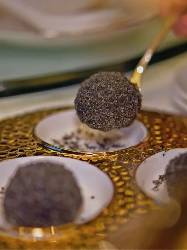 「黑芝麻湯圓」($136/2位):呢個湯圓擺盤好似藝術品咁!唔係浸喺糖水入面,而係類似「擂沙」嘅做法,外層裹滿香濃嘅黑芝麻,咬開係流沙餡,皮薄餡靚,煙韌控必試!⚫