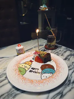 只需單點甜品即可享有生日免費畫碟服務,每日有設名額,敬請預訂,如有指定圖案/內容預早兩日WhatsApp,確認並需支付訂座訂金$200。畫功非凡加完美上色將超萌的角落生物高度還原,令人賞心悅目,點上蠟燭,讓節日添上滿滿儀式感,開心果巴斯克蛋糕口感濕潤細緻,散發純粹濃厚的果仁芳香。