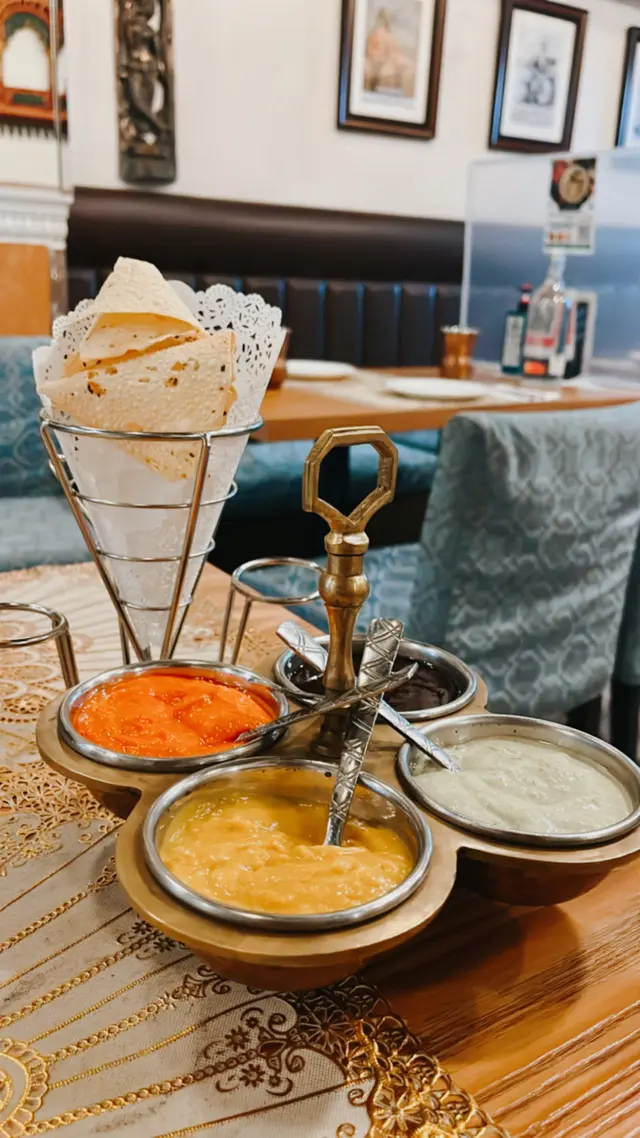 前菜有兩塊脆脆嘅薄煎餅,配合四款醬,分別係辣椒,薄荷,酸梅同咖哩,完成反映到印度菜有唔同調味料同醬料,好有特色。同埋見到餐廳安排嘅餐具同擺設都有花到心思,令到畫面都睇落好精緻。