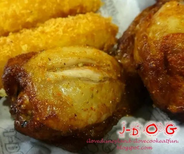 明太子通常味道較鹹辣, 店廚用它與青蔥碎、洋蔥碎去混合再釀入雞翼內, 鹹味的確減輕了但是鹹香的香亦同樣地走了, 只餘下點點辣的味感;炸到剛好的雞翼, 外皮炸至金黃通透, 沒留有多餘的油份, 雞肉的質地雖未至嫩滑但也不會有粗嚡口感, 新鮮炸起的雞翼就算沒有釀入物都是一項美味的食物。