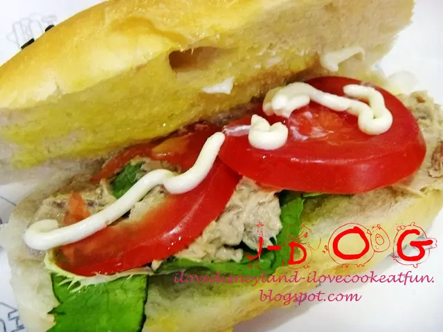 烘到熱脆的包子裏塗有牛油, 內餡是生菜葉、蕃茄片、吞拿魚碎及沙律醬;簡單的煮法就會有簡單的味道, 一咬下去, 蔬菜與吞拿魚沙律味道共融, 灑上黑芝麻的烘脆麵包既香口又軟熟, 的確保證啖啖滿足。