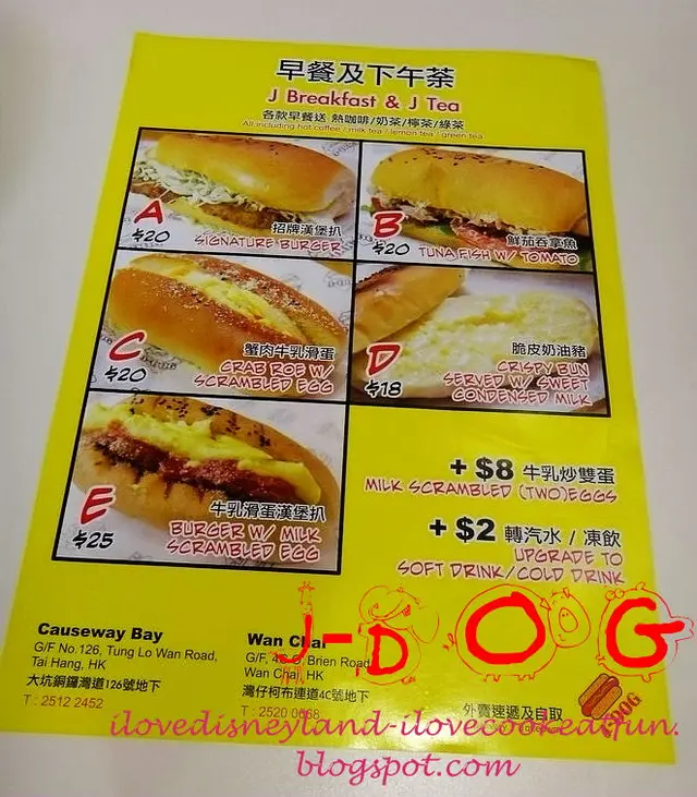早餐及下午茶也都是這五款款式, 價錢由$18 - $25 (還包熱飲), 不過順帶一提, 五款早餐裏也沒有熱狗的存在!