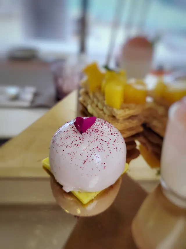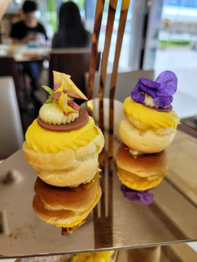 置頂的泡芙,蓋上了百香果忌廉,少許酸度,正好起了平衡的作用。