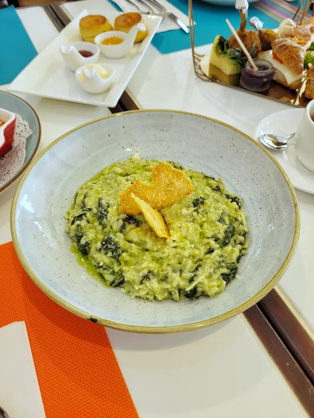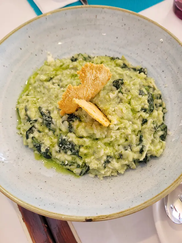 係 a la carte點了澳洲菠菜苗、蟹肉、芝士意大利燉飯($158,份量好足,飯粒有 al dente的質感,芝士完全溶入飯粒,很濃稠的味道,囝囝就最鍾意。