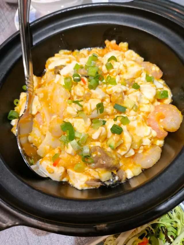 豆腐煲配料豐富有海蝦,帶子和魷魚,豆腐入口好嫩滑,每口豆腐都帶有香濃鹹蛋王味。