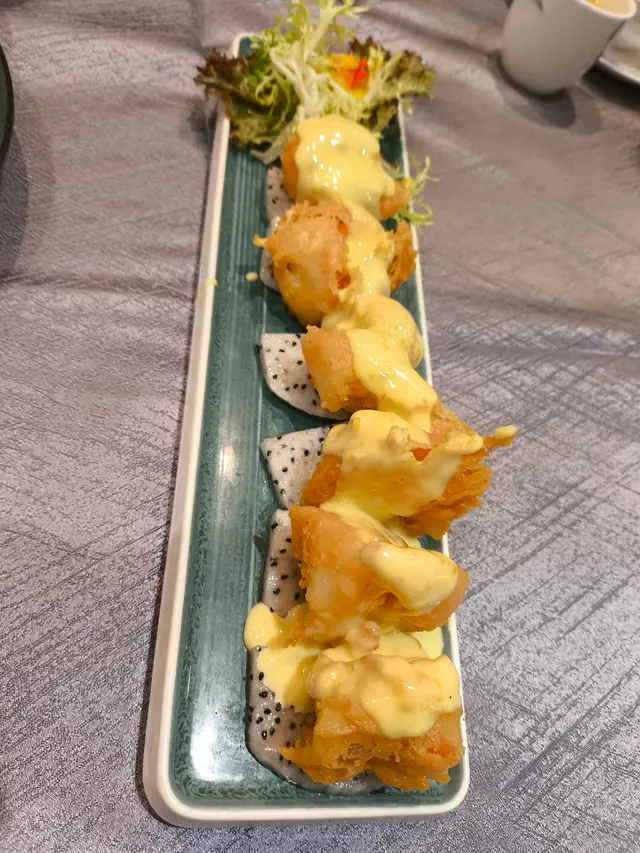 大大隻蝦球炸醬不太厚,廚師用芥末沙拉做配料,提昇鮮蝦的味蕾。