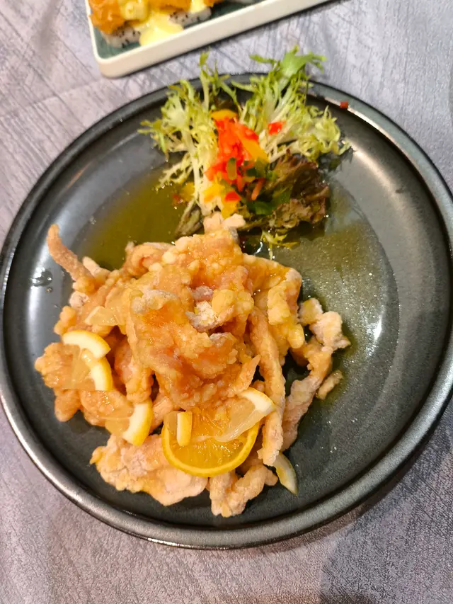 配有沙律菜和三色椒作伴碟,炸醬不太厚,酸酸甜甜唔會瀝,食落肉嫩有雞味。