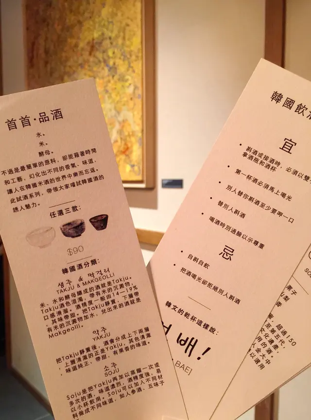 讓我拋拋書包,分享一下店方對這三款酒的介紹和有關背景資料吧  先飲味道最百搭又易飲的Jaheehyang。濁色的酒體經過兩個階段的發酵過程,再加入菊花釀製。除了是古典學者於遠足及背誦詩歌時品嚐的美酒外,更被Samsung集團選為祝酒及晚宴的招待飲品。這款酒相當易入口,微微甘甜又順喉。