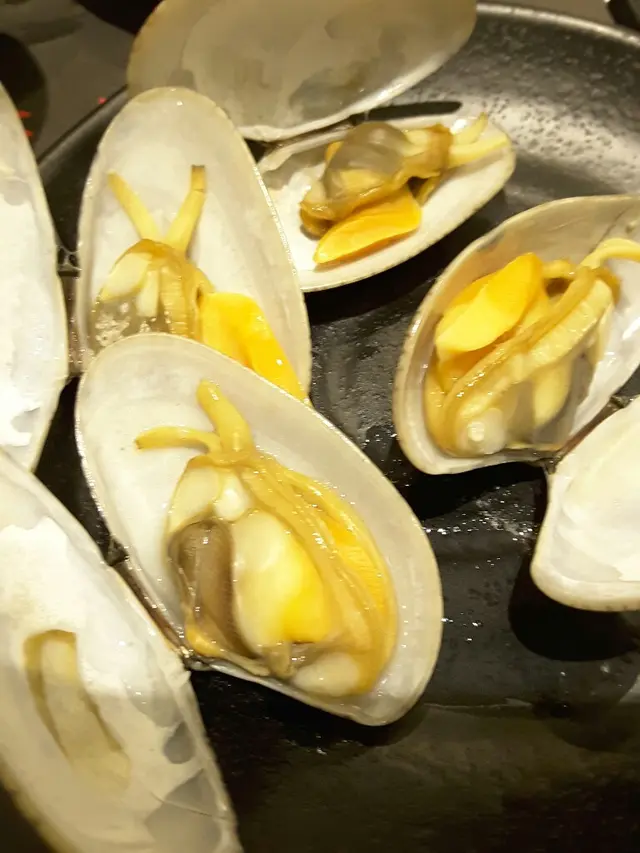 特大鮮甜扇貝,特大真係一D都唔誇張,一隻要分幾啖咬,蒸到大概七成熟,鮮甜脆嫩。此環節最大的特点係扇貝裙邊被拆下另上,整隻扇貝清潔的相當乾淨,可以放心食