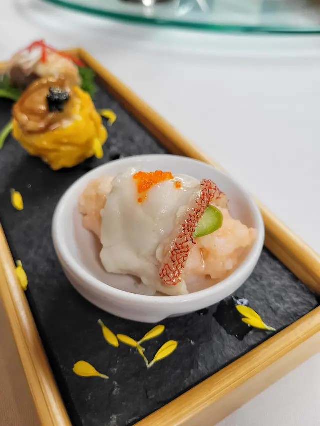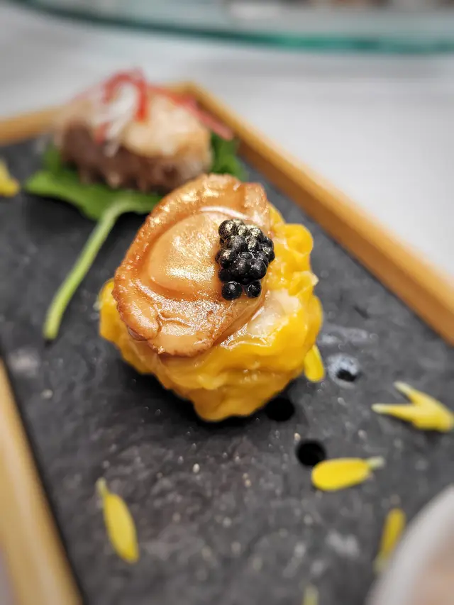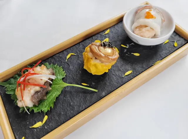 餐前先來個三式點心,分別是「腿蓉遼參燒賣」、「鮑魚燒賣」及「星班百花卷」。