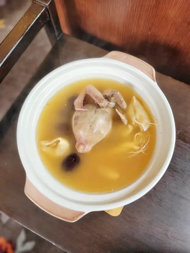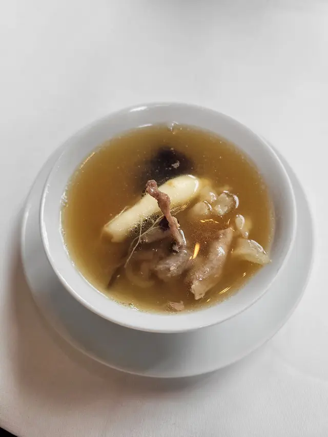再來是帶懷舊菜氛圍的「杞子人蔘花膠鴿吞素翅」,靈感源自懷舊手工菜「仙鶴神針」,用上了體型較大的頂鴿,去除胸骨後釀入已煨煮入味的金華火腿、關西遼蔘絲及素翅,全鴿與花膠人蔘湯同燉。鴿肉厚實多汁,咬落酥軟,湯底清澈鮮甜,入口一陣醇香,喝起來舌底生津。