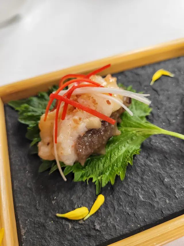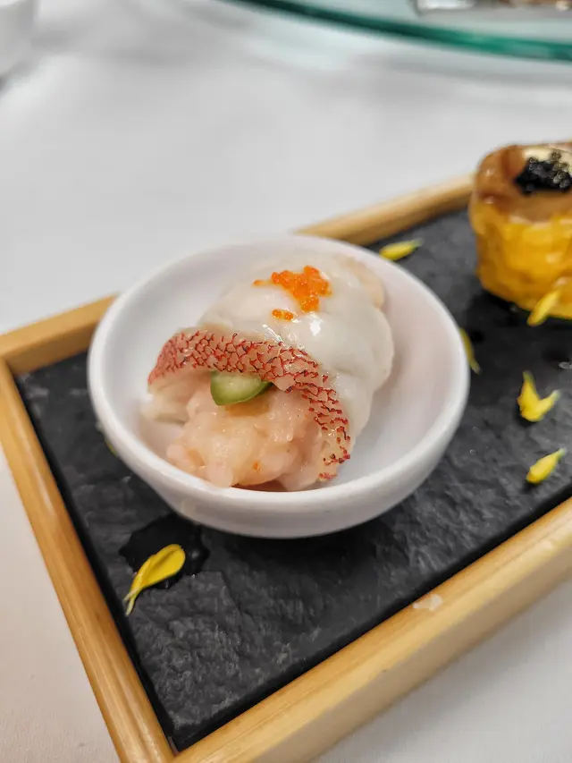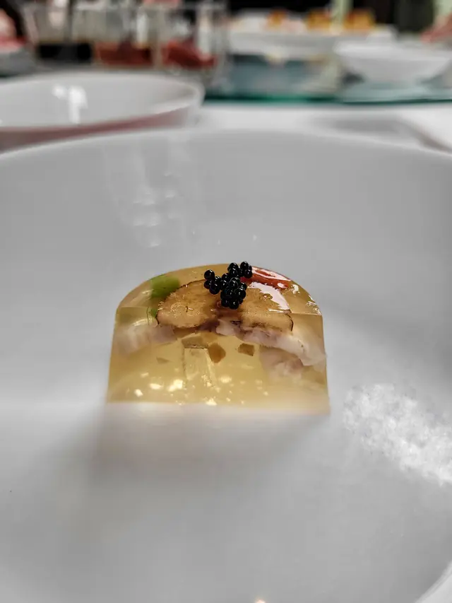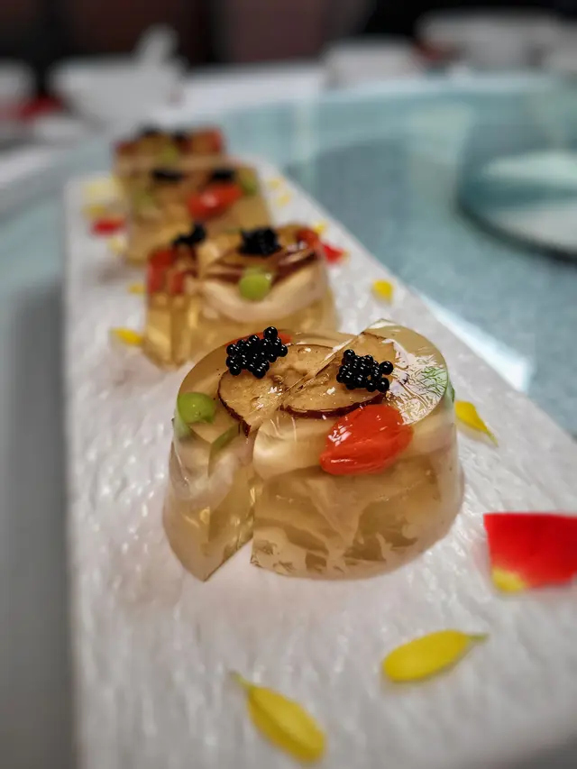 前菜的「紅棗人蔘豬手凍」,真是佩服大廚的心思,晶瑩剔透的人蔘雞湯凍,內裡是嫩滑的豬手,連皮切片後,與鮮人蔘粒、紅棗和蜜豆籽表面放上黑醋啫哩,不單平衡了油膩感,更有提鮮的作用。