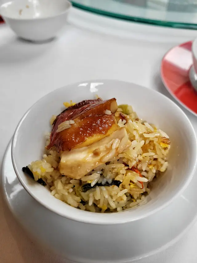 單尾是「窩燒麒麟鮑魚人蔘雞飯」,概念是源於經典菜式「金華玉樹雞」,鮮美的鮑魚片、三黃雞件、甘筍片及北菇片舖在加入人蔘鬚粒的米飯之上,拌和了香濃的人蔘鮑魚醬汁焗製而成,冒著熱氣上檯,非常誘人,但飯粒依然是粒顆分明,狀態大勇。