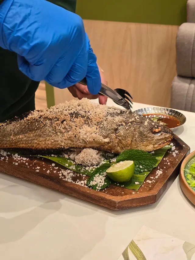 餐廳員工親自幫手起魚肉,儀式感滿分。魚釀入泰式香料,食落帶輕微辣味幾過癮。鹽焗需時約30分鐘,肚餓嘅朋友要注意🤣