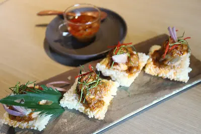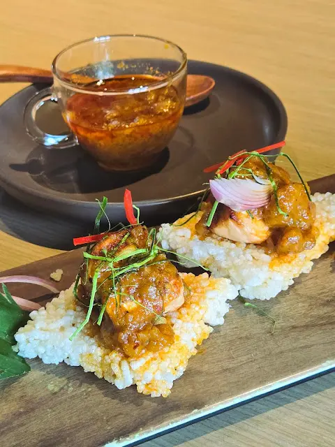 「三文魚脆米餅配香辣魚茸醬」($158)下層的脆米餅十分脆身,把上面的三文魚塊用匙羹稍稍壓至扁身後,舀少許鹹香少辣的魚茸醬在三文魚上,再連同脆米餅一起吃,無論味道和口感都能變得豐富立體,成為一道打頭陣的美味小吃。