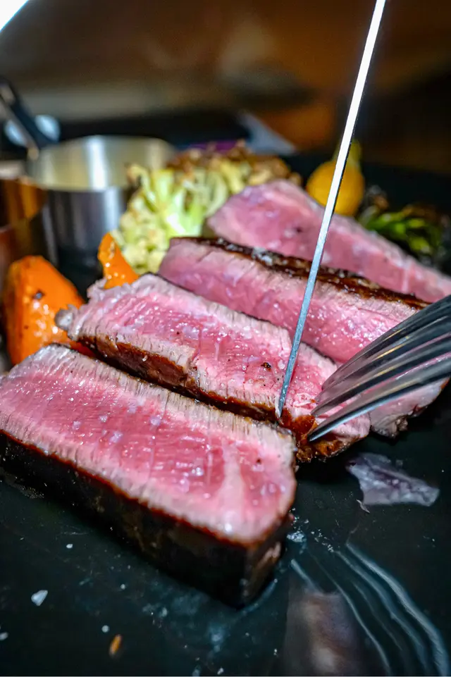 足8安士、切成4件厚身嘅美國安格斯牛柳扒🥩,叫咗5成熟,鮮嫩嘅色澤均勻相當吸引,外層嘅香烤焦脆、中層嘅熟成肉香、內層豐腴嘅肉汁同嫩口牛肉🐮,亦都以牛柳嘅特性——脂肪比例少同肉質較結實而帶出獨特口感,就咁食已經細味到牛肉嘅鮮香,仲未蘸兩款自製嘅燒肉汁同特製芥末醬🤓