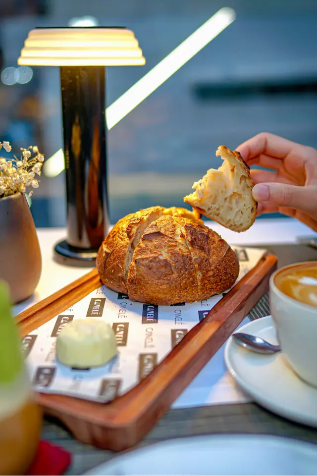 一開始上枱嘅酸種麵包已經為今餐打響頭炮💥,每日新鮮自家製造,未食已經聞到麵包香🤤,上到枱仲喺啱啱烤焗完熱辣辣🔥。成個菠蘿包咁大切開六份,麵包外層相當鬆脆香口,包裹住煙韌得嚟又夠晒Airy嘅鬆軟麵包內層,配埋一啲都唔油膩、非常夾嘅海鹽牛油一齊食真喺無得彈🧈,如果可以直接買佢哋嘅麵包一定會再食多個!