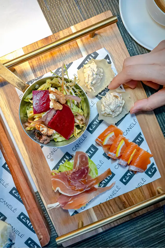 呢個拼盤有特色沙律🥗,當中有核桃、紅菜頭、車厘茄、沙律菜,加上柚子汁、日本醋、橄欖油同Adela酒4款酒汁嘅配搭,味道相當開胃又特別,愛酒之人一定好鍾意😎;另外仲有蟹肉沙律雲吞、煙三文魚同西班牙嘅伊比利亞火腿,