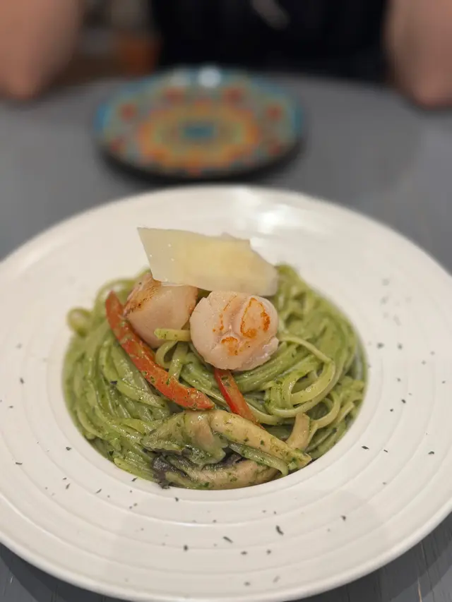 首先係青醬帶子扁意粉🍝🌿!一上枱就聞到好香濃嘅羅勒味!青醬掛滿每一條扁意粉,唔會太油膩,味道啱啱好。主角帶子大大粒,煎到金黃色,外脆內軟,鮮甜到不得了!成個配搭好清新,食完成個人都好fresh!💚