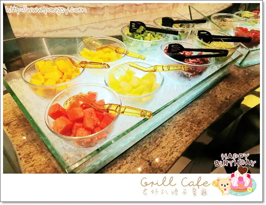 自助吧的水果類有西瓜、菠蘿、蜜瓜及哈密瓜,蔬菜類則有羅馬生菜、紫生菜、紫椰菜、豆苗、粟米粒及車厘茄等等,基本的沙律蔬菜齊備,非「碎碎爛爛」、質素不俗。