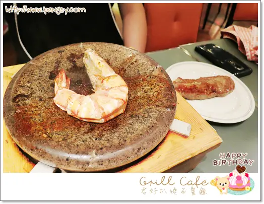 還要穿上圍裙,一切準備就緒。登凳,兩口子最期待的石燒出場嚕!!!(石燒龍蝦尾配新西蘭肉眼牛扒及石燒大蝦配新西蘭西冷牛扒)侍應推出餐車,於我倆面前把生肉放在高溫石頭上,並即場把龍蝦尾起殼(也許怕連殼會燒得不夠熟吧),再略作講解後便由兩口子DIY燒燒燒。