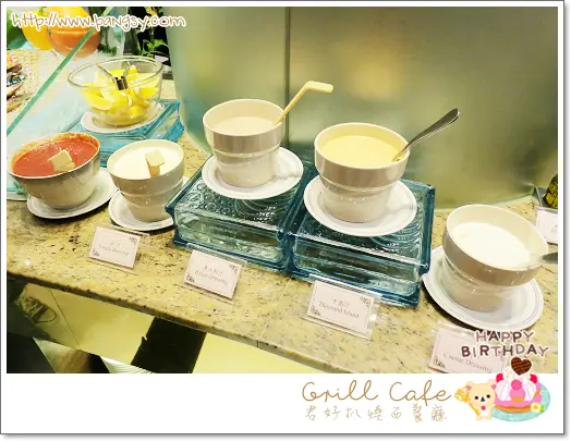 對了,還有自助甜品。男友一向不嗜甜,取捨之下我只拿了最最最最最最想吃的,「因為唔啱食/食唔晒都冇人執手尾,最後會變成浪費~」。白色的是荔枝果凍,沒啥味道啊,純粹是兒時的魔芋(蒟蒻啫喱)情意結。麵包布甸暖烘烘的,食感濕潤而鬆軟,又不太甜,推推推。而蛋糕方面我之所以選藍莓芝士蛋糕,是因其標明是《Passion by Gerard Dubois》出品,閃閃眼mode啟動,此店是我的wishlist店之一啊,難得這裡有供應,當然要吃啦!!!!忌廉芝士味濃而順滑、餅底厚薄均等,配上帶酸度的藍莓醬,表現不負我所望喔。