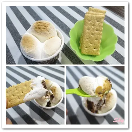 我用餅乾點棉花糖中間的醬, 當混入了香蕉花生朱古力棉花糖, 多重口感, 非常好味.