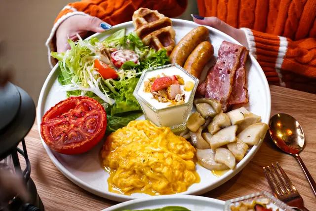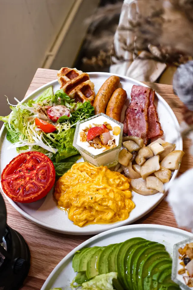 📍香煎紐倫堡腸•煙肉•牛油雜菇•滑蛋•牛角窩夫•希臘乳酪 蕃茄•沙律($128)