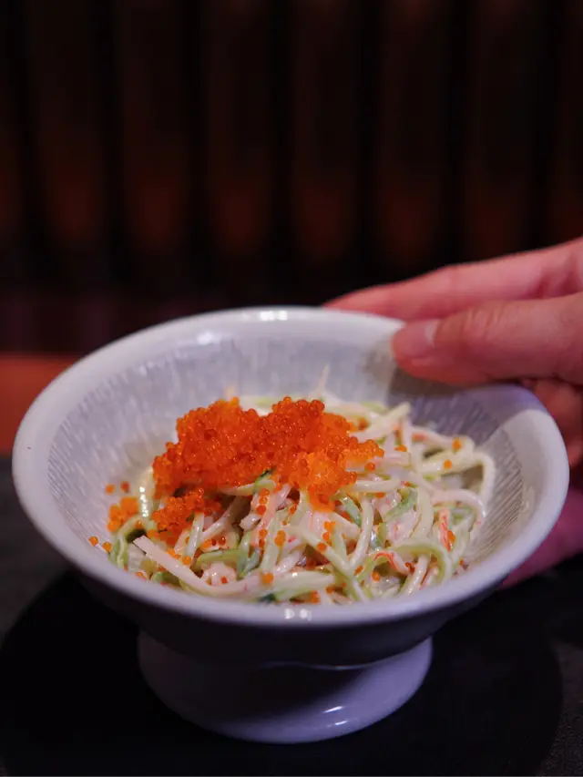 蟹籽沙律,上面鋪滿了橙紅的蟹籽,下面是香脆的沙律菜,沾上了一種酸甜的日式沙律醬,非常開胃。我用筷子夾了一口,蟹籽爆漿在口,沙律菜清脆多汁,沙律醬增加了風味,很美味。